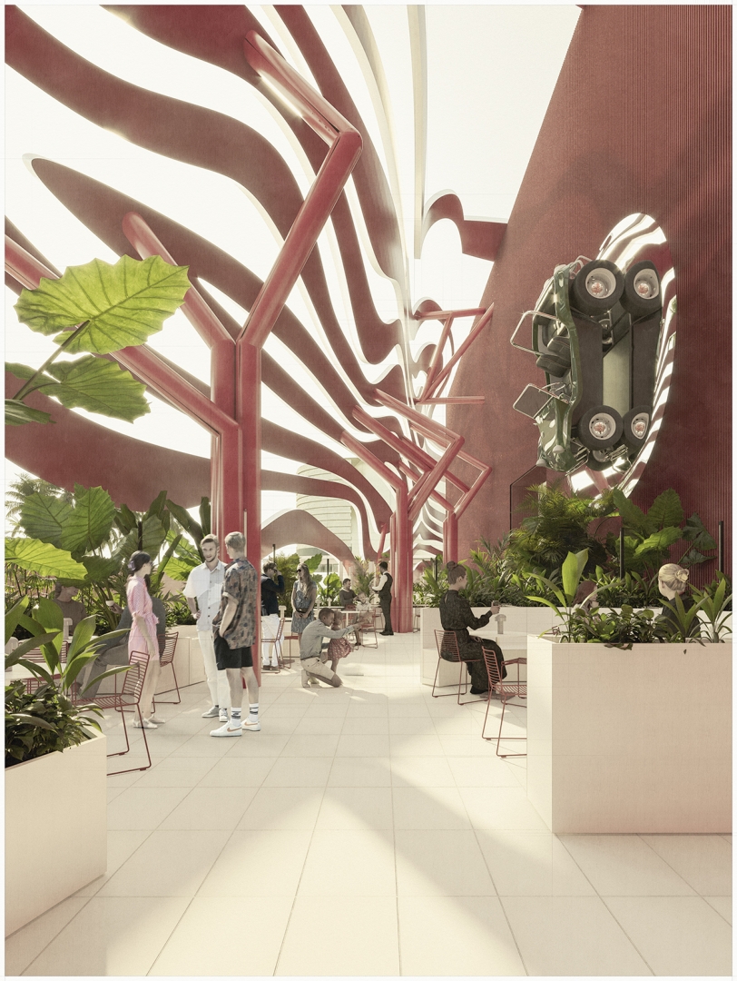 Mirror walls, mirror columns and a mirror ceiling that doubles the lighting fixtures, are all deliberate attempts to make the space harder to grasp. Outside, the terrace is imagined as an oasis: an intimate garden sheltered by lush palm trees in the middle of the concrete jungle of Los Angeles.