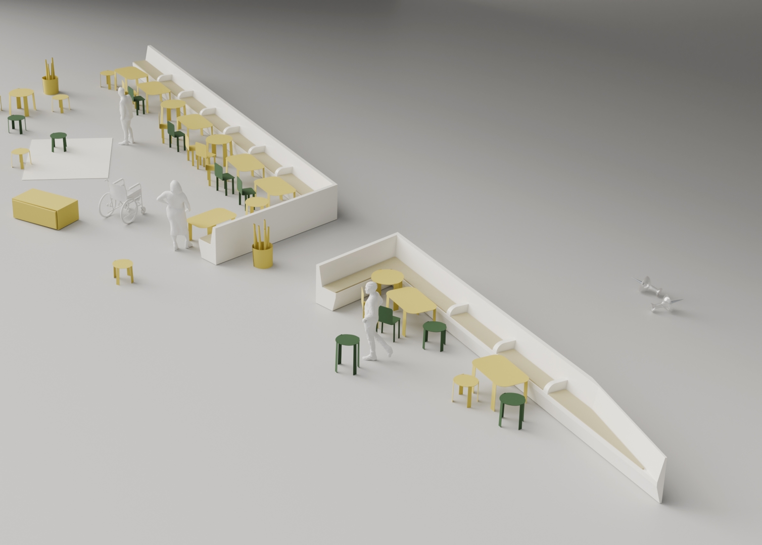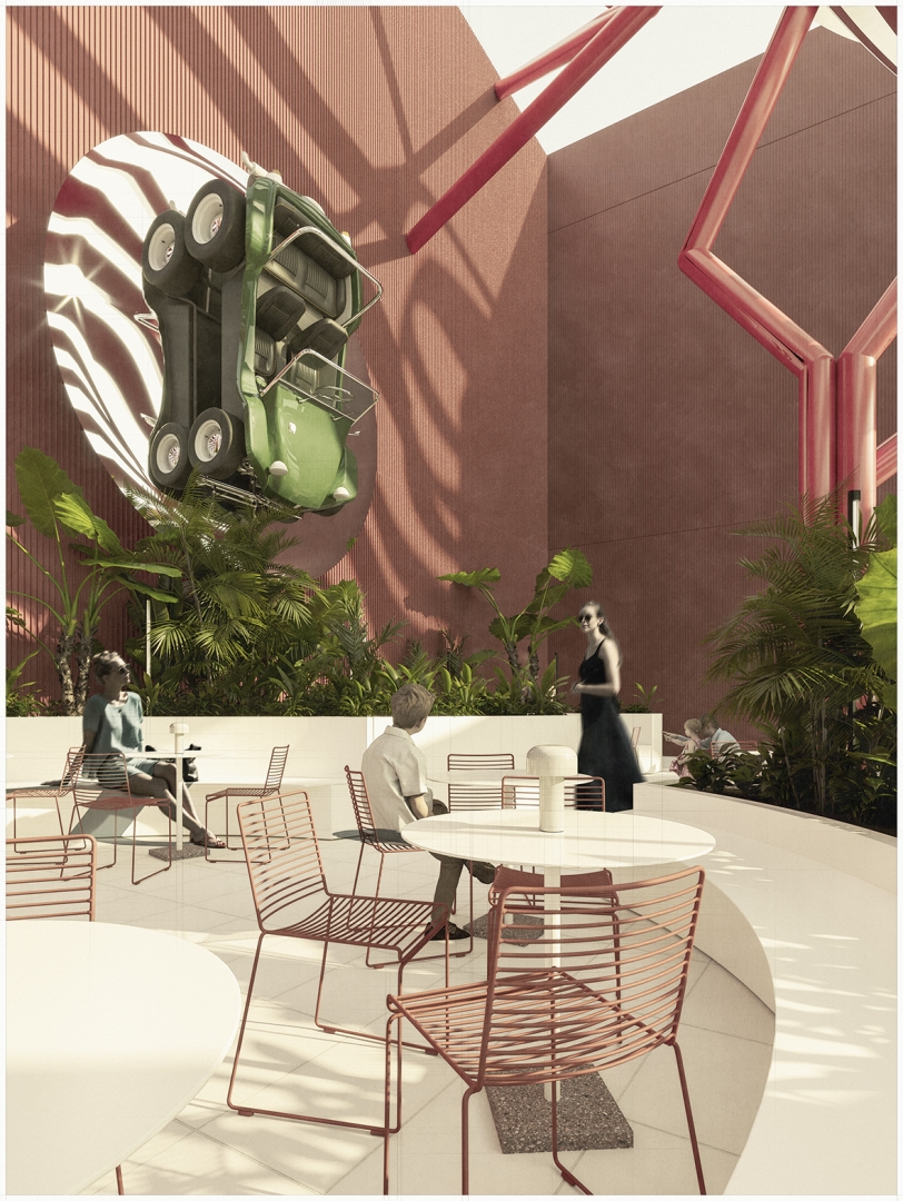 The renovation of the restaurant has been conceived as a disruptive intrusion in the otherwise homogenic building.