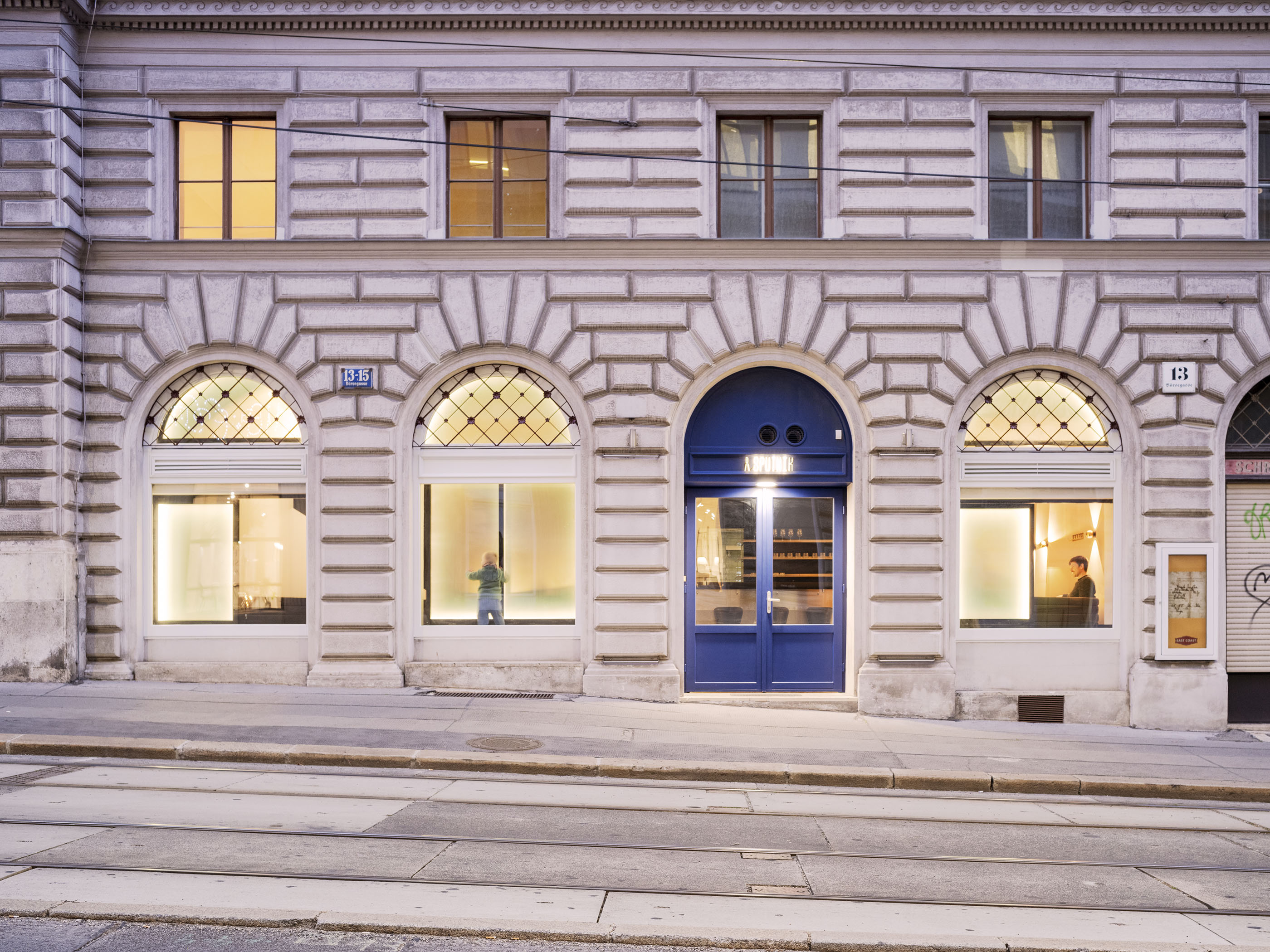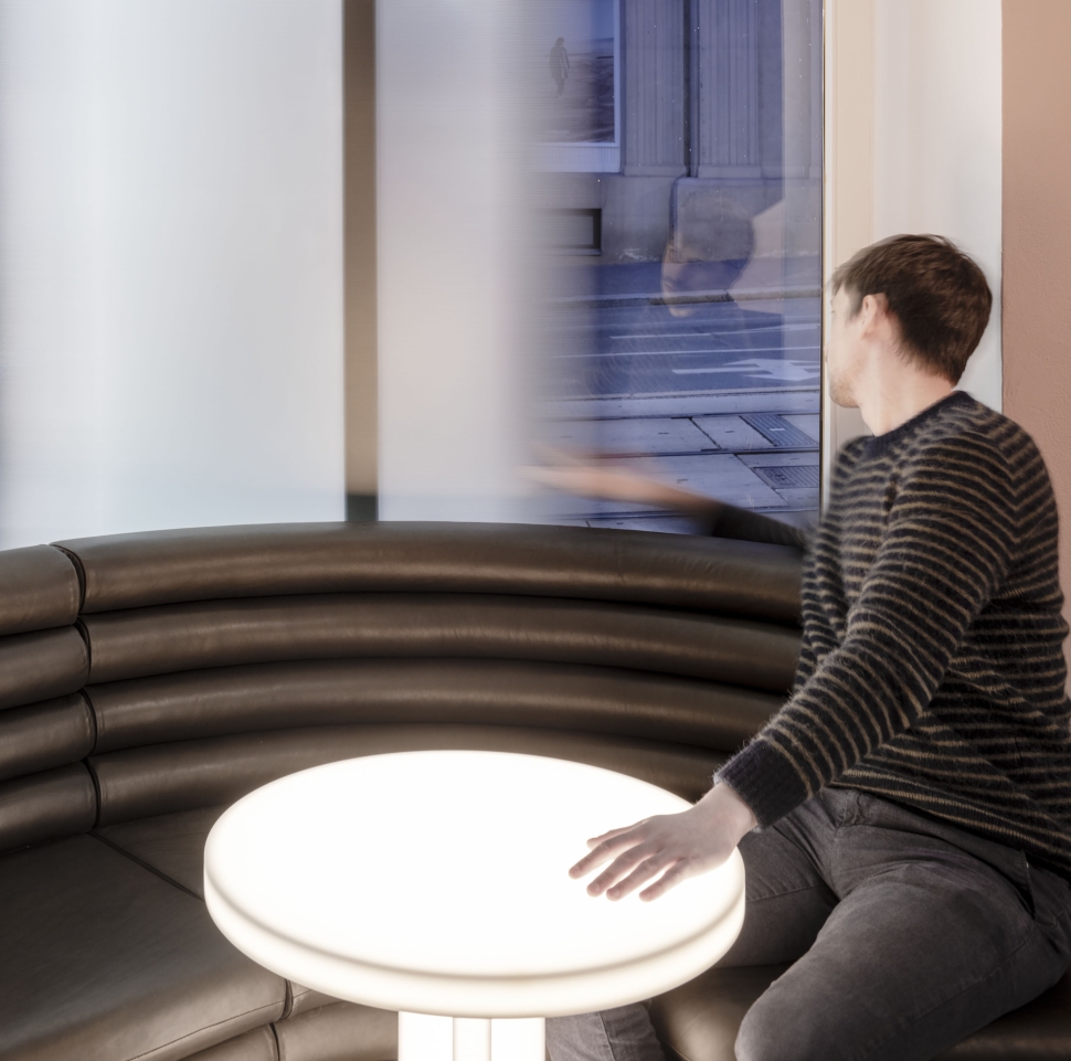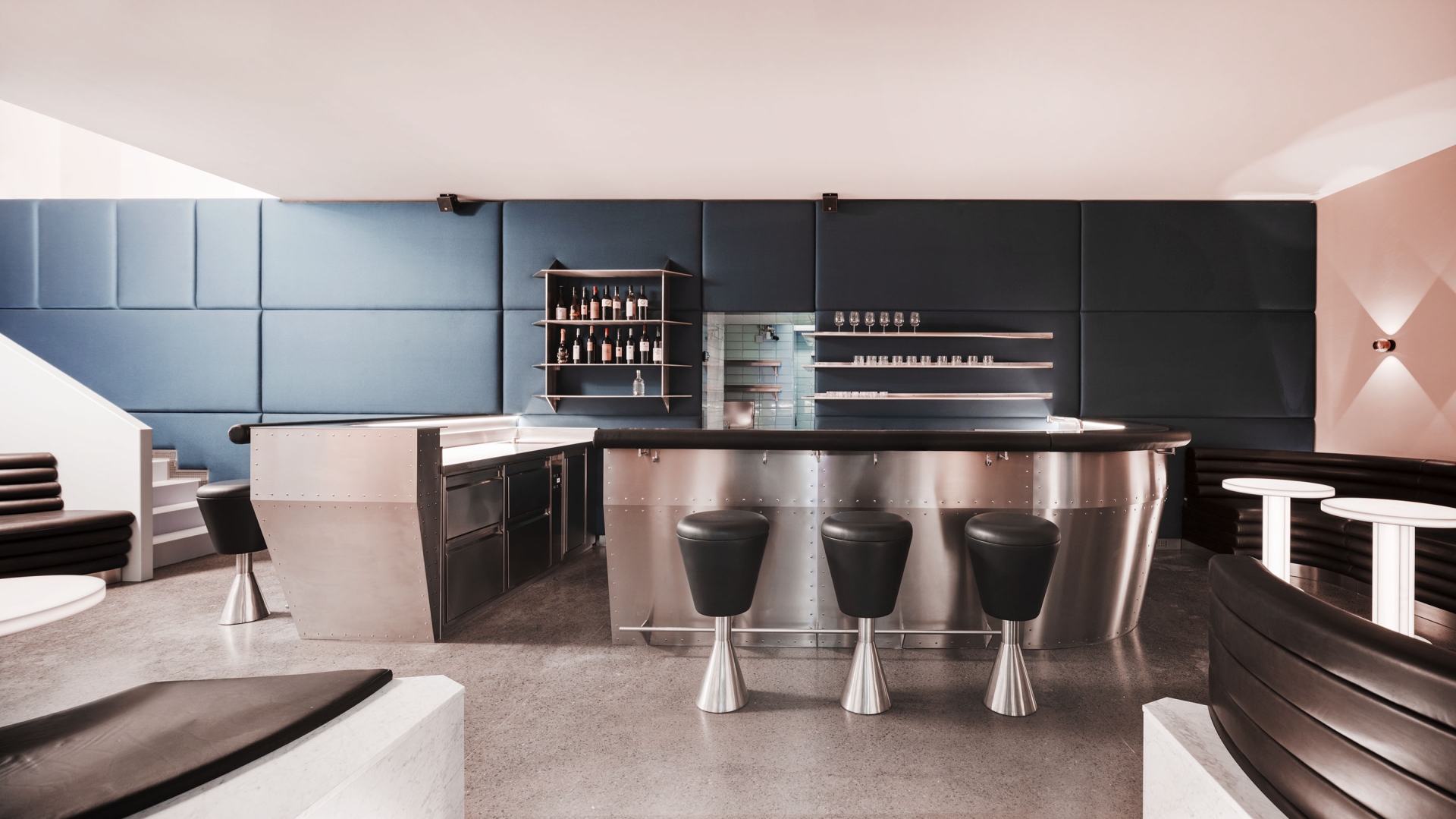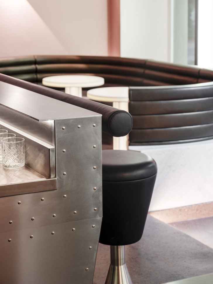 It also has something of the American diner, more because of the spacecraft references than despite them – diners being susceptible to neophilia themselves. Sputnik’s circular seating suggests sociability that feels North American, and the stainless steel bar and stools evoke burgers and milkshakes as much as they evoke cocktails. America is also referenced, albeit indirectly, in the glow tables, as they allude to the ones Adolf Loos employed in his American Bar more than a hundred years ago in the same area of Vienna.
