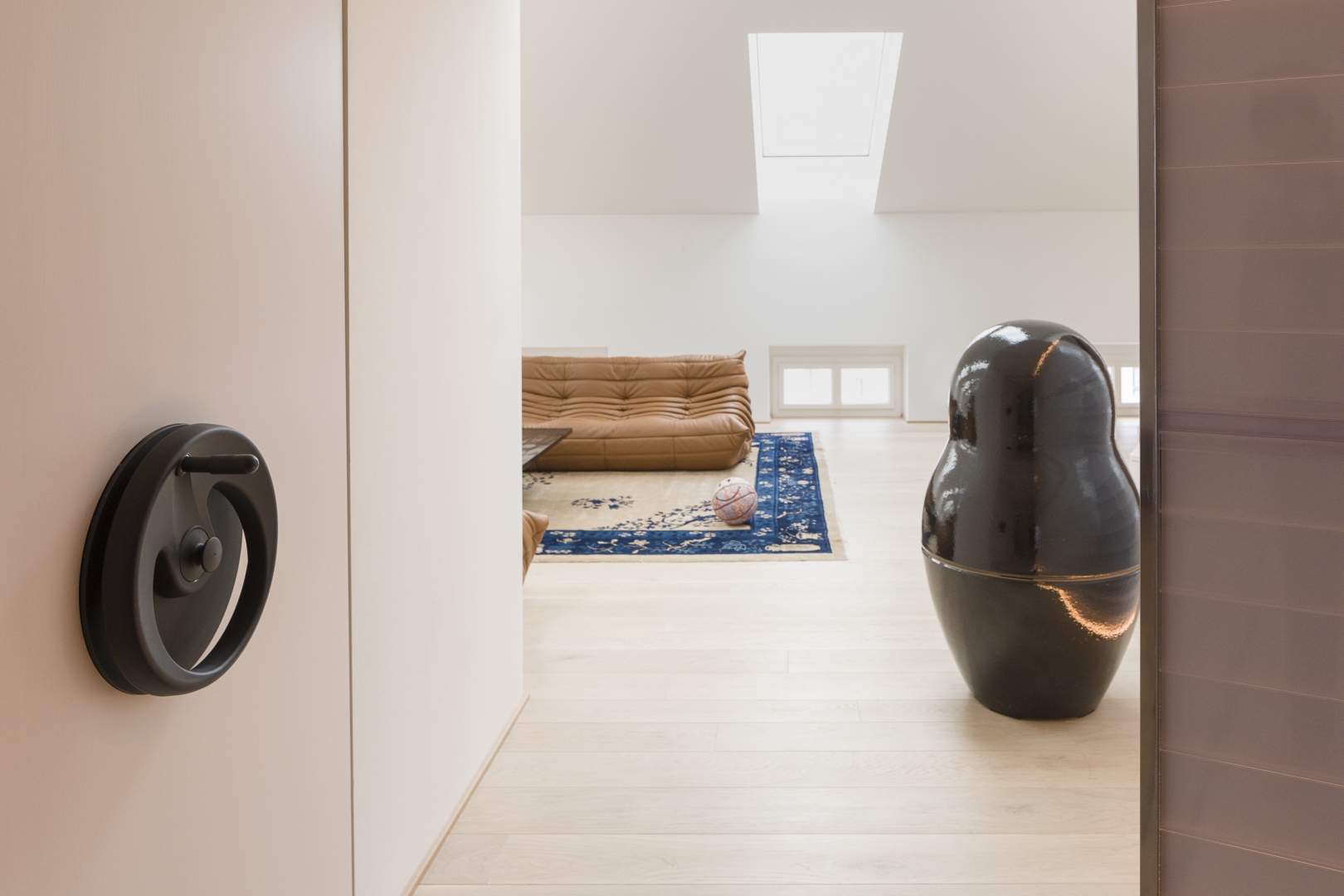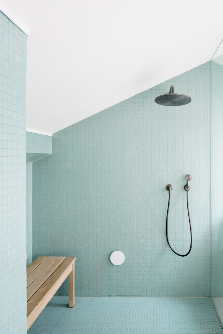 Thus a layer of unfired clay bricks lines the entire ceiling. Grooves cut into them permit pipes with hot or cold water to run through. Clay increases insulation and lowers the apartment’s carbon footprint. And the painstaking efforts to install a geothermal heat pump in a protected area dispensed with the necessity of air conditioning.