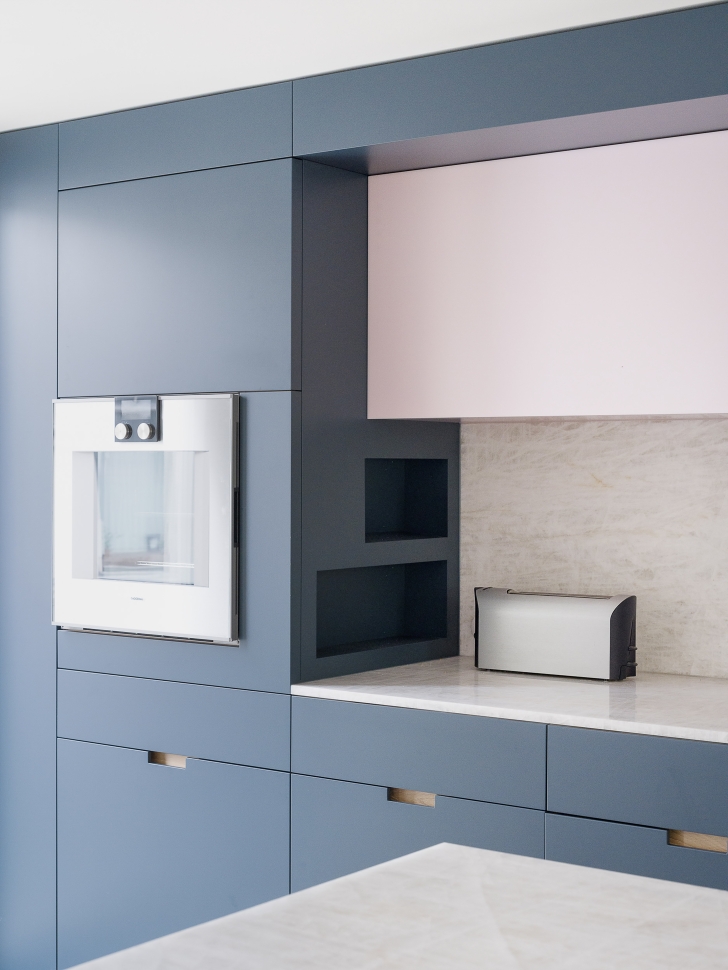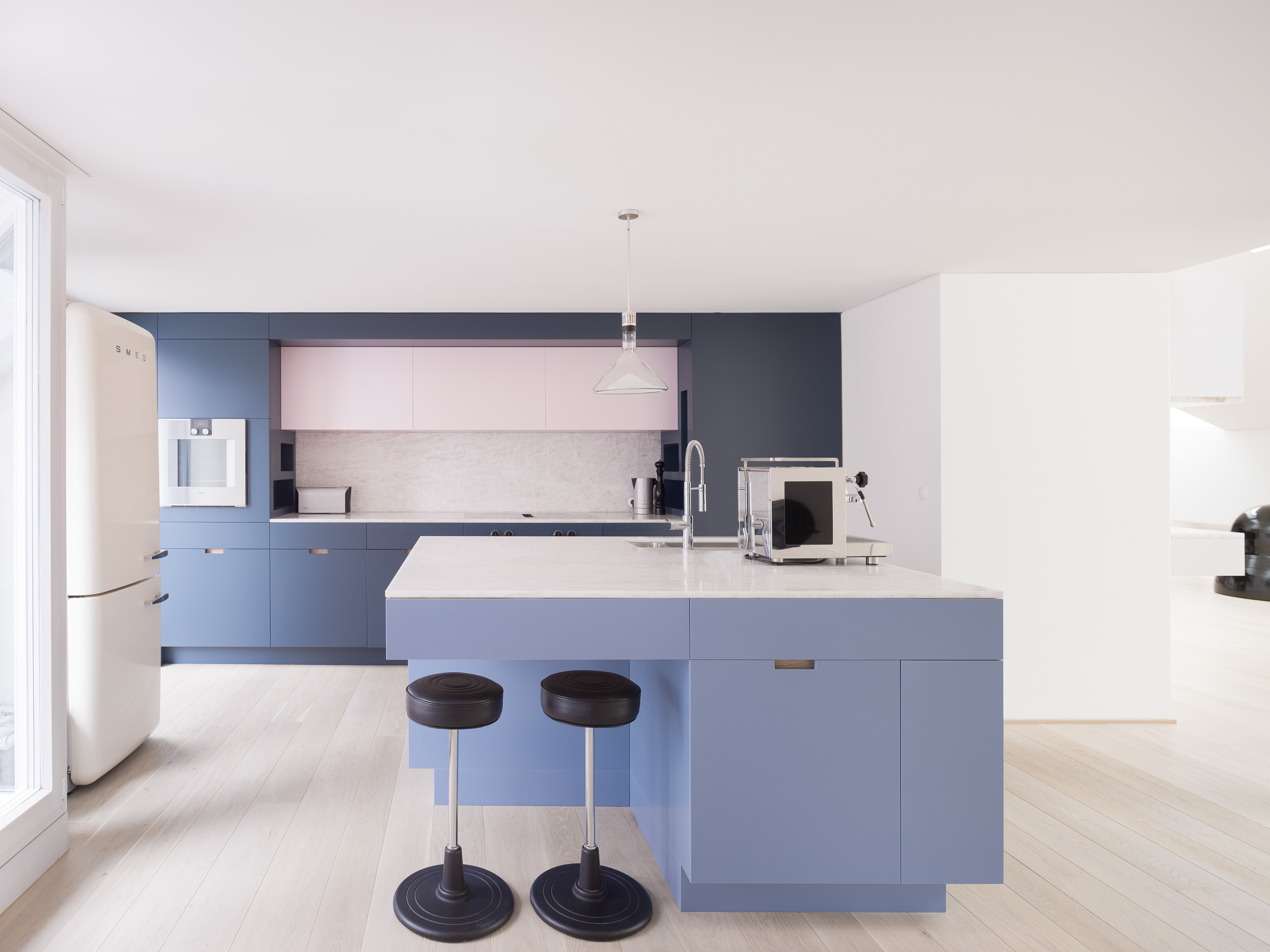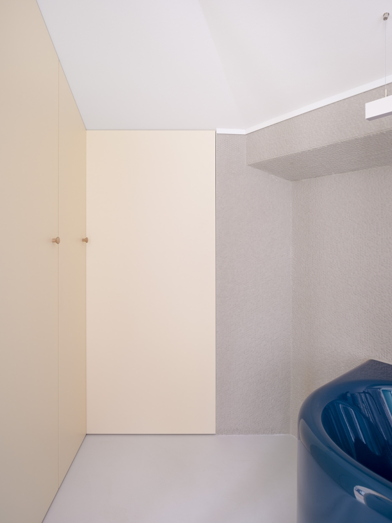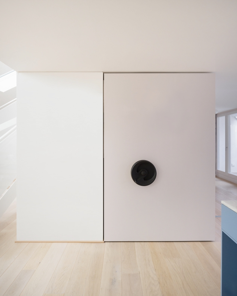 Curtains that are not unshy lend paucities of chromatic mischief to the predominantly white apartment. The pink cabinets in the kitchen are weighed against the dominant cerulean blue and Corian tops. From there one glimpses the taut lines of the staircase with its railing made of perforated steel, which has the vocation for projecting lightness. The aim is softness, executed with precision.