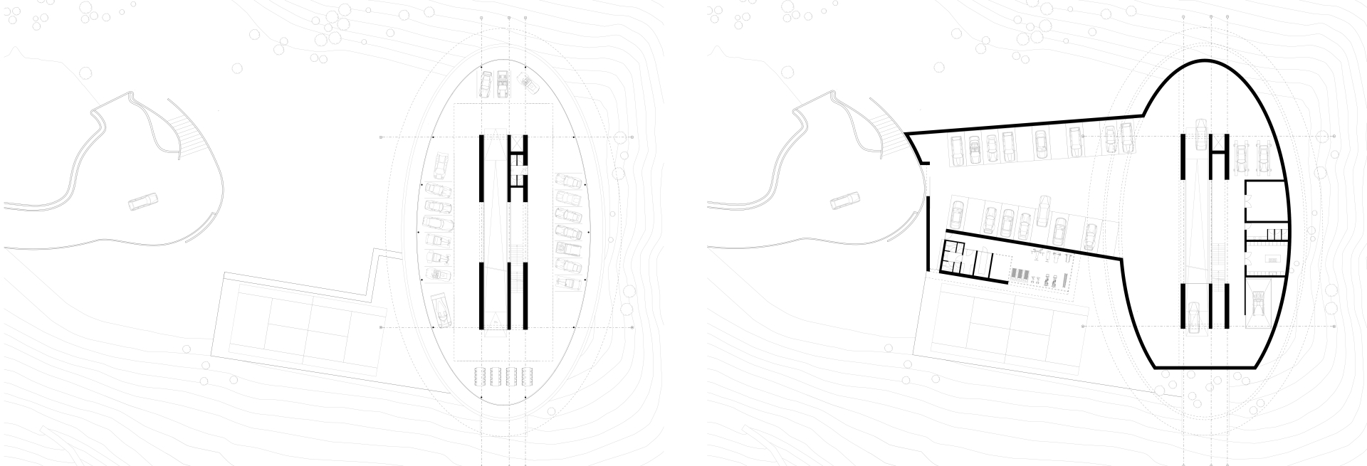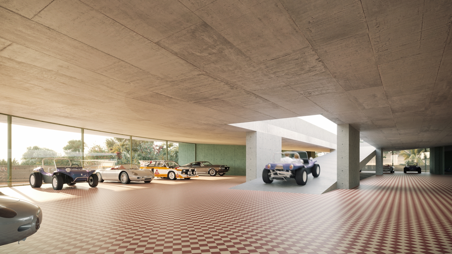 Here a kart racing track sits on-top of an automobile gallery with a capacity for 20 cars on display and over 90 in storage. Driving miniature cars in the company of friends over the roof is a tongue-in-cheek form reenacting the tectonic change that automobiles, freeways and intersections have had on our lives. It’s a toy version of commuting.
