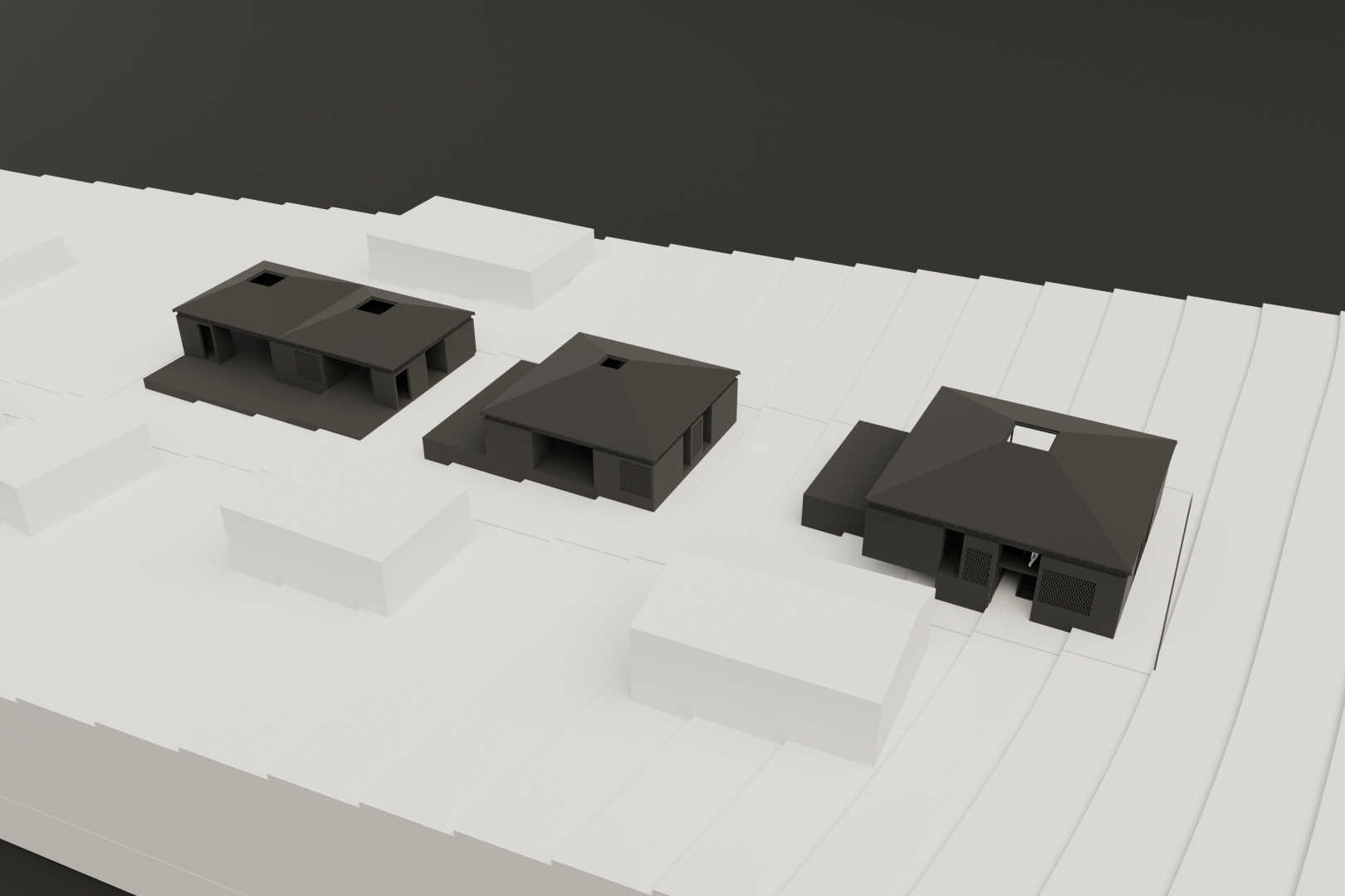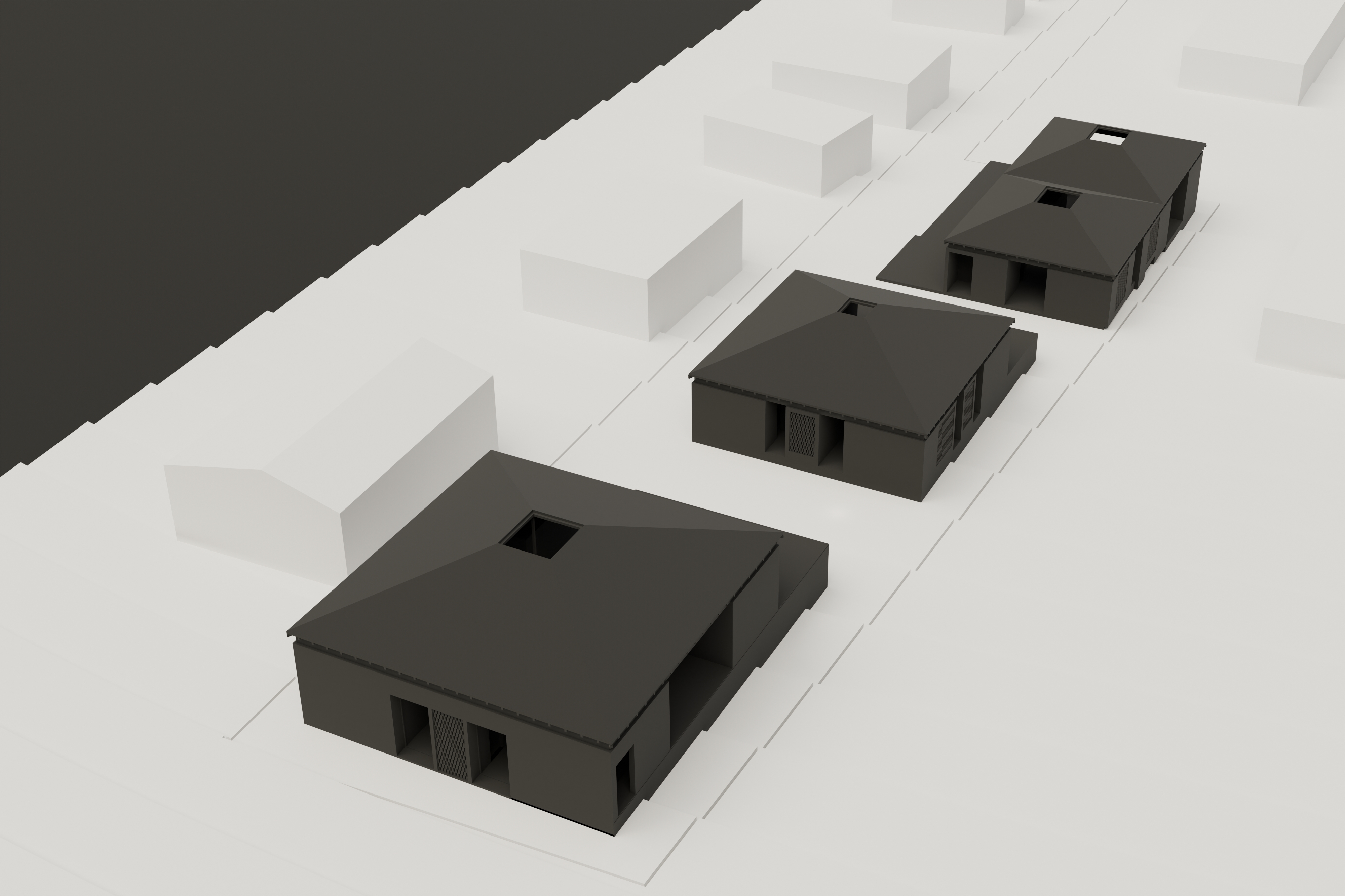 In a sense the window has been obliterated from the project - every opening is a thoroughfare. Glass is hardly required. From outside the compiosition of each villa is a very well defined composition: a stark, laconic base and a pyramid roof.