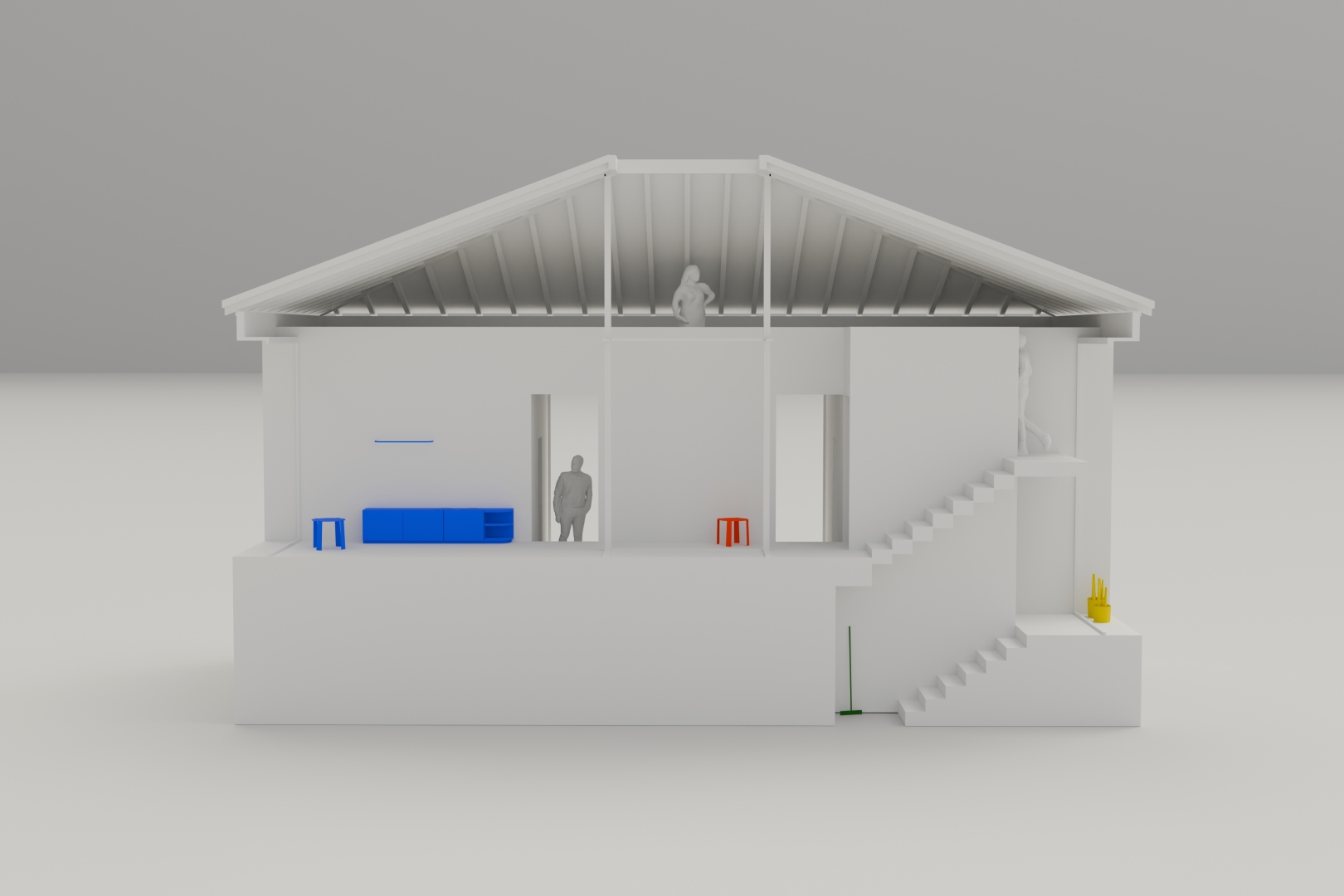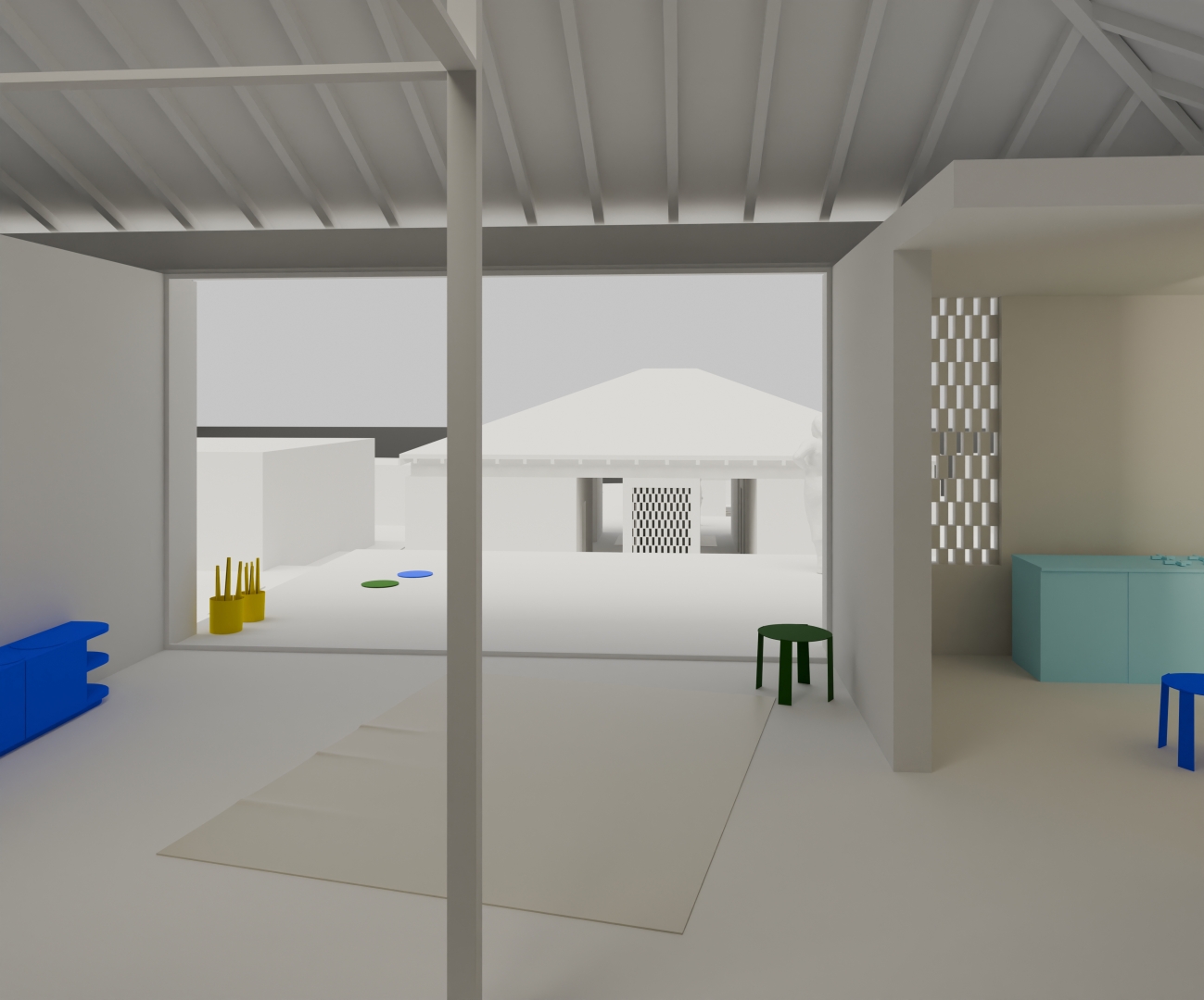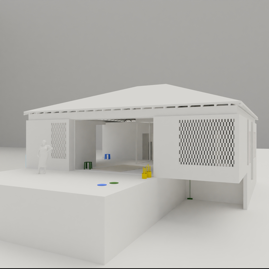 Louis Kahn's Trenton Baths (New Jersey, 1959) was the starting point of the villas. The warm weather of Barbados allowed for a variation of Kahn's building that is truer to the original than the version we had previously explored in a house on Lake Zell (Zell am See, 2021). The limit between inside and outside could be infinitely more porous than in the harsh climate of Austria. Just a few masonry walls support the overarching wooden hip-roof.