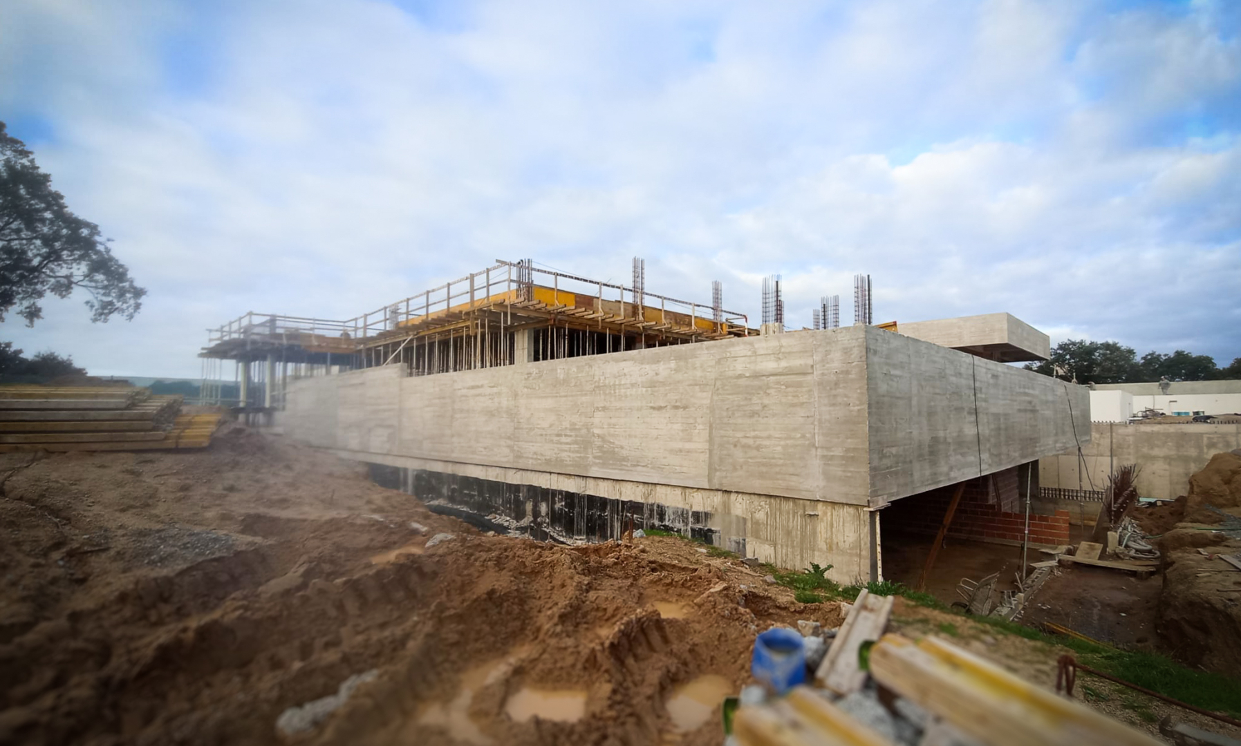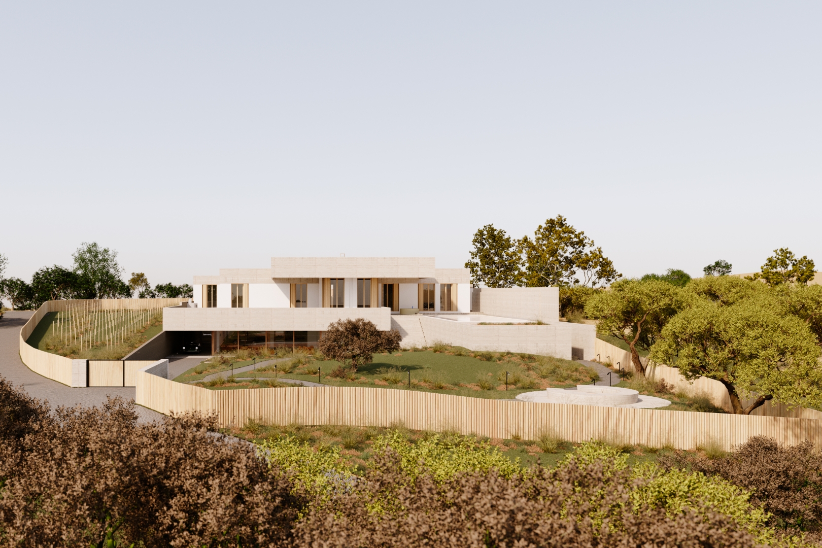 Acres and acres of vineyards are the site of this Mediterranean holiday home for a car enthusiast. One can easily read a variation of a classic composition, with a sturdy concrete base, white and lighter partition walls, and then a heavier-than-usual frieze above.