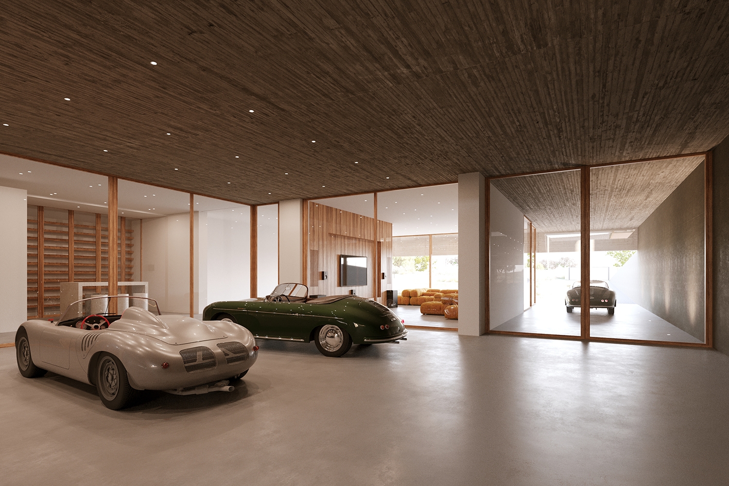 Half sunken, the stylish garage welcomes the vehicle with glass doors and a polished floor that flows smoothly into a living room, from where the cars are never out of sight.