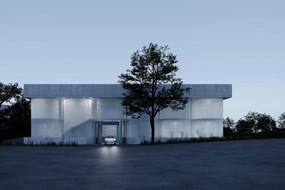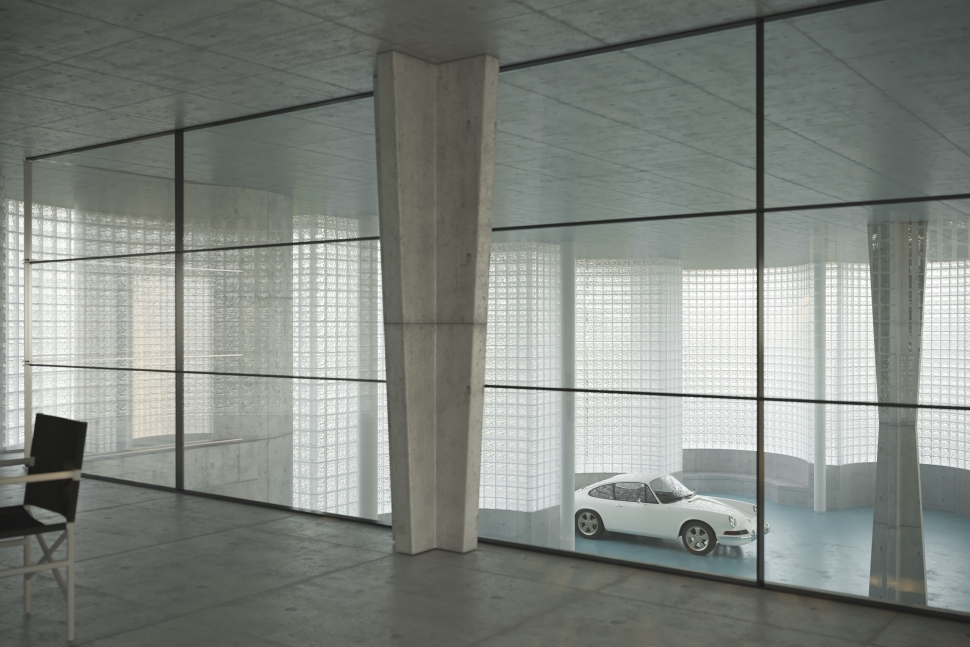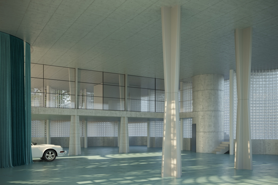 A small apartment on the mezzanine level allows the collector to sleep amidst his cars. His bed is snugged into one of the glass-block lobes just like the cars below, declaring that whatever is good for the automobile is good for the human. Turned inwards towards the gallery, the living area becomes a viewing platform from where to admire, commend and command. And select. And drive away.